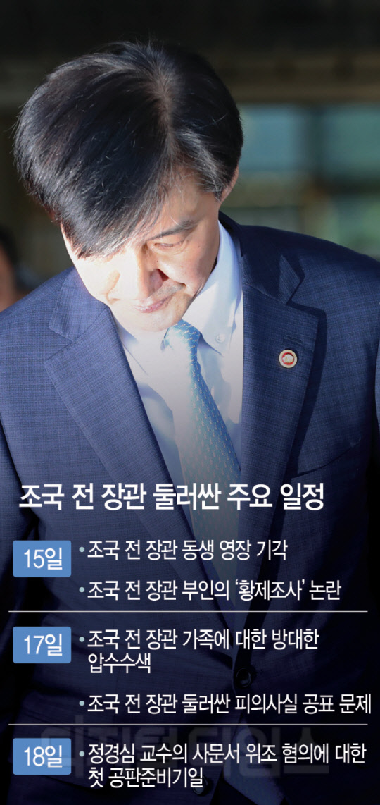 ◇오는 18일 '조국 사태' 두달 만에 첫 재판 시작= 오는 18일에는 정경심 교수의 사문서 위조 혐의에 대한 첫 공판준비 기일이 예정돼 있다. 공판준비기일에는 피고인의 출석 의무가 없어 정 교수가 직접 재판에 나올 가능성은 낮을 것으로 보인다. 특히 정 교수 측은 검찰이 사건기록 열람·등사를 거부하고 있어 재판 준비를 하기 어려운 상황이라며 지난 8일 재판부에 기일 연기를 요청했다.