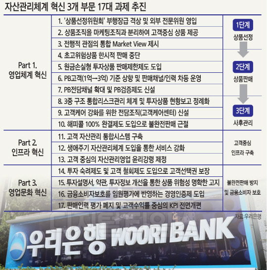 우리은행은 고객 중심 자산관리체계를 실현하기 위해 △상품선정, △판매, △사후관리 전 과정에 걸쳐 영업체계를 혁신하기로 했다. 우선 상품선정 단계에선 외부 전문가로 구성된 상품선정위원회를 구성해 전문성과 객관성을 확보하기로 했다. 이와 함께 현재 WM그룹과 신탁연금그룹의 자산관리업무를 상품조직과 마케팅조직으로 분리해, 고객 수익률을 제고하는 고객 중심 조직으로 개편할 예정이다.