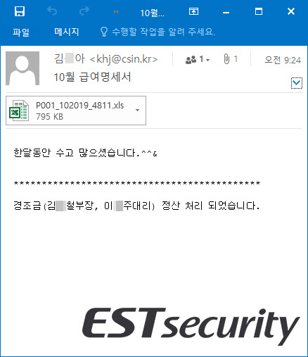 이날 통합보안기업 이스트시큐리티에 따르면 이번 공격은 악성 파일을 첨부한 이메일을 특정 대상에게 발송하는 해킹 이메일 공격 방식을 사용하고 있다. 많은 국내 기업이 급여를 지급하는 20일, 25일 시기에 맞춰 '10월 급여명세서' 안내를 위장한 메일과 악성 파일을 배포하고 있는 것으로 확인됐다.