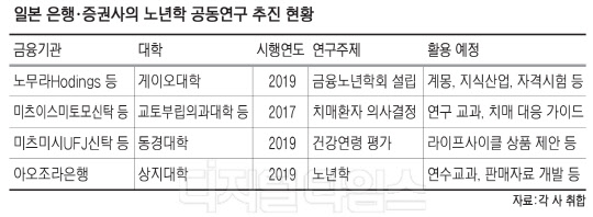 일본 금융업계는 이 같은 정부의 금융정책과 고령층 고객 증가에 부응하기 위해 대학들과 노년학에 기반한 공동연구를 활발히 추진 중이다.