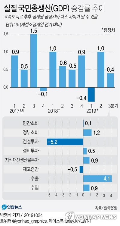 올 한국 경제성장률에 대한 적신호가 3분기 더욱 강해졌다. 3분기 국내총생산(GDP) 성장률은 0.4%를 기록하면서 다시 0%대로 내려앉았다.