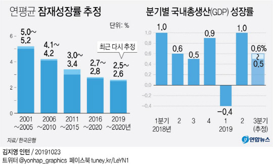 박양수 한국은행 국장은 "잠재성장률이 2.5%까지 떨어졌지만 지금의 2%는 10년 전 2%와는 충격이 다르다"면서 "10년 전 잠재성장률에 비해 지금의 잠재성장률은 많이 떨어진 상태"라고 지적했다. 이어 박 국장은 "추세적 성장률(잠재성장률)이 떨어지고 있기 때문에 정책당국자들은 생산성 향상, 신성장동력 확보 등 성장 잠재력을 높이는 데 주력해야 한다"고 말했다.