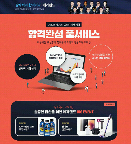 이 외에도 수험생이 100% 경품을 받을 수 있는 '수고했어 나의 1년' 이벤트가 메가랜드 홈페이지에서 진행된다. 공인중개사 시험장에서 받은 스크래치 쿠폰의 당첨 코드를 입력하면 꽝 없이 모두 선물을 제공받을 수 있다. 공인중개사 시험 난이도 설문 이벤트에 참여하면 다이슨 청소기, 헤어드라이기, 갤럭시탭, 에어팟, 아이콘x 등 경품의 주인공이 되는 기회가 주어진다.