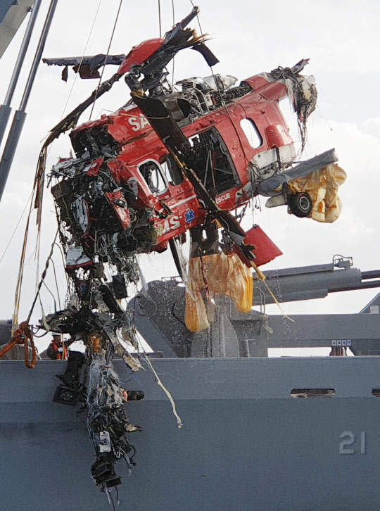 독도 인근 해상에서 추락한 소방헬기가 3일 해군 청해진함에 의해 인양되고 있다. 해경은 이날 오후 2시 4분께 소방헬기 인양을 완료했다고 밝혔다.