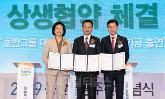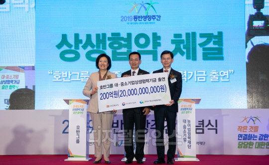 박영선 중소벤처기업부 장관(왼쪽)이 6일 서울 여의도 중소기업중앙회에서 열린 '2019 동반성장 주간 기념식'에서 김상열 호반그룹 회장(가운데), 김순철 대·중소기업·농어업협력재단 사무총장과 대·중소기업 상생협력기금 출연 협약식을 마친 뒤 기념촬영을 하고 있다.