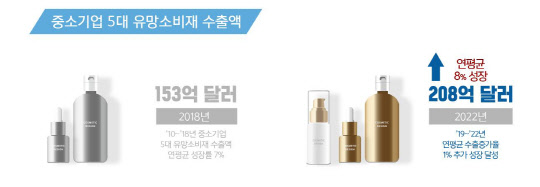 이 방안을 통해 화장품, 패션의류 등 중소기업 5대 유망 소비재 수출을 2022년까지 연평균 8% 성장한 220억 달러로 끌어 올리고, 5대 유망 수출기업도 2022년까지 4만7500개사로 키워겠다는 전략이다.