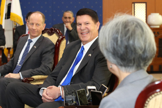 강경화 외교부 장관이 6일 서울 종로구 도렴동 청사에서 키이스 크라크 미국 국무부 경제차관(가운데), 데이비드 스틸웰 미국 국무부 동아시아·태평양 담당 차관보(왼쪽)와 이야기를 나누고 있다.