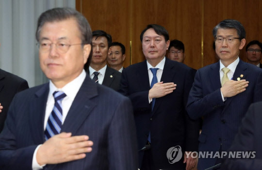 조국 사태의 후속대책을 논의하기 위한 청와대 반부패정책협의회에서 문재인 대통령과 윤석열 검찰총장이 만났다. 두 사람은 모든 참석자가 악수하는 과정에서 한 차례 악수를 했을 뿐, 이후 눈빛조차 마주치지 않았다.