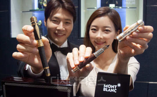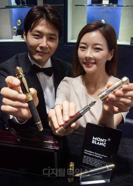 12일 서울 중구 롯데백화점 에비뉴엘에서 모델들이 '몽블랑 문화예술 후원자 오마주 투 하드리아누스 에디션' 만년필을 선보이고 있다.