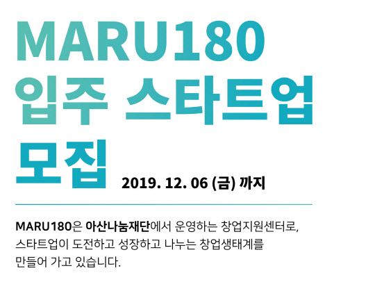 [디지털타임스 김양혁 기자] 아산나눔재단은 창업지원센터 마루180의 2020년 상반기 입주 스타트업을 모집한다고 12일 밝혔다.