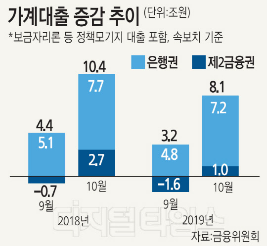 그러나 10월 은행권 가계대출은 크게 늘었다. 지난달 은행권 가계대출 증가액은 7조2000억원으로, 올해(1∼10월) 월평균 증가 폭(4조6500억원)을 크게 웃돌았다. 9월에 4조8000억원으로 꺾였던 가계대출 증가세가 다시 한 달 만에 반등한 모습이다.