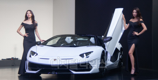20일 오후 서울 중구 제이그랜하우스에서 열린 '람보르기니 데이 서울 2019'에서 모델들이 전세계 800대 한정 생산된 아벤타도르 SVJ 로드스터 차량과 함께 포즈를 취하고 있다.