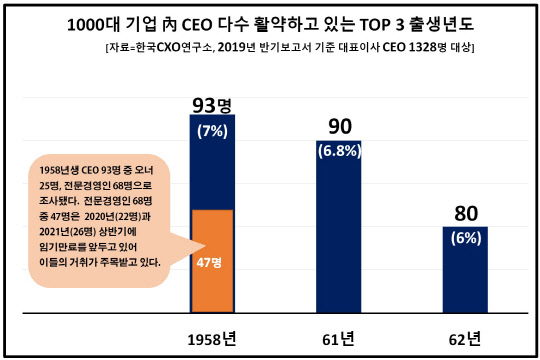 27일 기업분석 전문업체 한국CXO연구소가 국내 1000대 기업 CEO 현황을 분석한 결과에 따르면, 올해 반기보고서에 대표이사로 명시된 CEO 1328명 중 93명(7%)이 1958년생이다. 1961년생(58세)가 90명(6.8%), 1962년생(57세)가 80명(6%)로 뒤를 이었다.