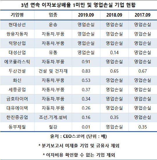 영업손실을 본 기업을 포함해 3년 연속 이자보상배율이 1 미만인 한계기업은 한진중공업과 금호타이어, 동부제철, 두산건설, 현대상선, 쌍용차, 덕양산업, 대성산업, 세종공업, 대유에이텍, 화신, 에코플라스틱 등 12개사이며, 이 가운데 현대상선과 쌍용차, 덕양산업은 3년 연속 영업적자를 이어가고 있다.