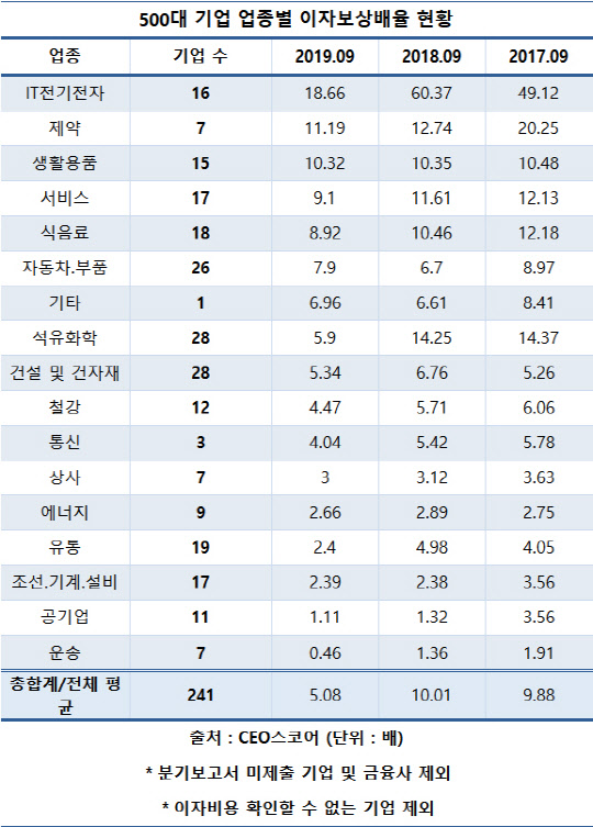 27일 기업평가사이트 CEO스코어에 따르면 국내 500대 기업(금융사 제외) 가운데 분기보고서를 제출하는 241개사의 3분기 누적 기준 이자보상배율은 평균 5.08로 집계됐다. 이는 지난해 같은 기간 10.01보다 4.93포인트 하락한 수치다.