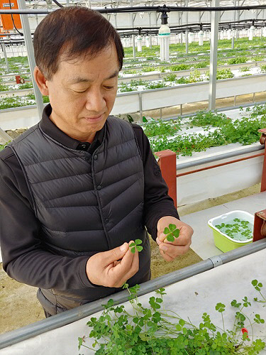 식용 네잎클로버 독점 종자권을 보유한 농업회사법인 (주)푸드클로버 홍인헌 대표가 경기도 과천시 과천동에 위치한 농장서 네잎클로버 상태를 확인 중이다.
