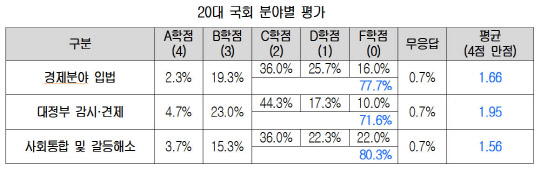 대한상공회의소가 국내 300개 기업(대기업 100개, 중소기업 200개)을 대상으로 '20대 국회에 대한 기업인식과 향후과제'를 조사한 결과, 경제분야 입법은 4점(A학점) 만점에 평균 1.66점(C학점과 D학점 사이)을 받았다고 1일 밝혔다. 사회통합 및 갈등해소는 1.56점, 대정부 감시·견제 분야는 평균 1.95점 등 전 분야에 걸쳐 C학점을 밑돌았다.