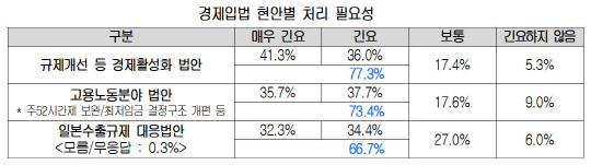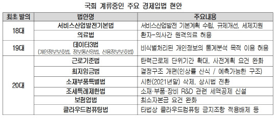 실제로 서비스산업발전기본법 제정안과 원격진료를 허용하는 의료법 개정안 등은 18대 국회에서부터, '데이터 3법' 등은 19대 국회부터 발의됐지만, 여전히 처리되지 않고 있다. 20대 국회에서 처음 발의된 법안 가운데 주52시간제 보완(근로기준법), 최저임금 결정구조 개편(최저임금법), 클라우드컴퓨팅 규제완화(클라우드컴퓨팅법), 핀테크산업 등 자본금요건 축소(보험업법 등), 일본수출규제 대응(소재부품특별법, 조특법 등) 등은 이번에 통과되지 못하면 입법지연이 장기화할 것으로 우려되고 있다. 기업 대다수도 주요 경제현안 처리의 긴급성을 호소했다. 규제개선 법안에 대해서는 77.3%가, 근로시간제 보완 등 고용노동분야 법안은 73.4%가, 일본 수출규제 대응법안은 66.7%가 '법안 처리가 긴요한 상황'이라고 응답했다.