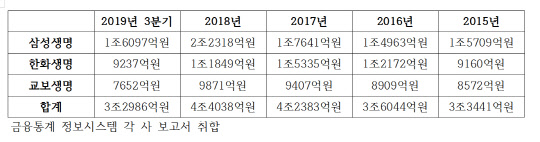 2일 디지털타임스가 생보업계 '빅3 보험사(삼성생명·한화생명·교보생명)'의 5년 치 재무재표를 분석한 결과에 따르면, 이들 주요 생보사의 사업비는 매년 증가하고 있는 것으로 집계됐다. 이들 3개 생보사가 지난 2015년 사용한 사업비는 3조 3441억원이다. 이후 2016년 3조 6044억원을 시작으로 2017년 4조2383억원, 2018년 4조4038억원으로 매년 증가했다. 4년 새 1조 597억원(31.6%)이 늘어난 것이다. 또 올해 3분기까지의 사업비는 3조 2986억원으로, 지난 2015년 총 사업비 지출 규모에 이미 근접해 있는 상황이다.