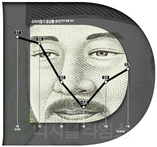 2일 통계청이 발표한 '11월 소비자 물가 동향'을 보면 소비자물가지수 상승률이 11개월 연속 0%대에 머물고, 근원물가는 20년 만에 가장 낮은 수준으로 떨어지면서 우리 경제가 디플레이션(경기침체 속 물가하락)에 진입했다는 분석이 잇따라 제기되고 있다. 지난달 기준 마이너스(-) 물가는 간신히 벗어났지만, 전년동기 대비 상승 폭이 0.2%에 그쳤고 전월과 비교하면 0.6% 하락해 저물가 기조가 지속되고 있어서다. 이런 가운데 소비자물가의 선행지표인 10월 기준 생산자물가지수(103.61)는 1년 전보다 0.6% 하락, 물가상승을 억제하는 요인으로 작용하고 있다.