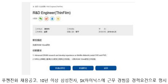 반도체 업종에서도 푸젠진화(JHICC)가 올 4월 인력 채용 공고를 내면서 '10년 이상 삼성전자·SK하이닉스에서 엔지니어로 근무한 경력자 우대'를 명시하는 등 인력 빼가기를 노골화한 것으로 나타났다.
