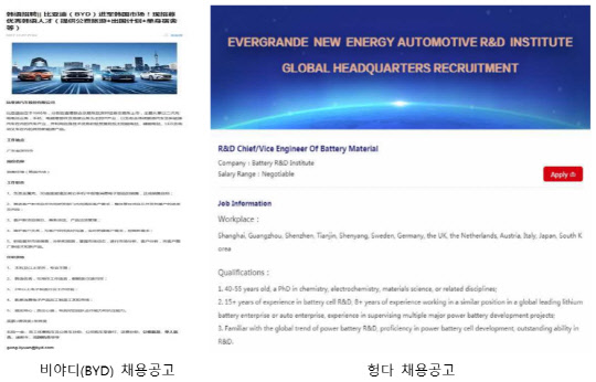 또 중국 최대 부동산그룹 '헝다'는 올초 신에너지차 기업을 설립하면서 8000여명의 글로벌 인재를 채용했는데, 특히 한국, 일본, 독일, 스웨덴 등 9개국 출신 경력자를 우대한다고 밝혔다.
