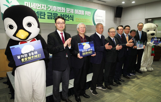 김영호 한국사회책임투자포럼 이사장(왼쪽 세번째)을 비롯한 참석자들이 3일 서울 영등포구 전경련타워에서 열린 '미세먼지·기후변화 문제해결을 위한 탈석탄 금융 선언식'에서 기념촬영을 하고 있다.