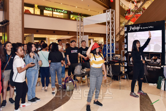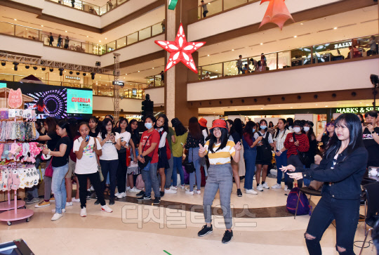 지난 7일 필리핀 마닐라 샹그릴라 플라자(Shangri-La Plaza)에서 주필리핀한국문화원 주최로 열린 '2019 게릴라 케이 나잇 콘서트(2019 Guerilla K-Night)'에서 마닐라 시민들이 'K-Pop Dance Master'를 체험하고 있다.