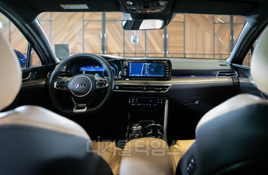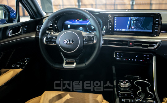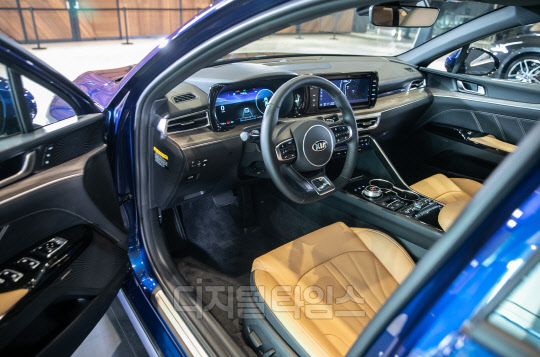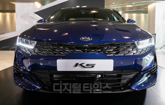 12일 광진구 그랜드 워커힐 서울 호텔에서 기아자동차 신형 K5(3세대) 신차발표회가 열렸다. 사진은 전시된 K5 차량 모습.
