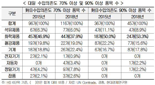 현대경제연구원이 유엔 국제무역통계를 분석한 결과에 따르면 일본 수입의존도가 90% 이상인 품목은 2015년 36개에서 지난해 45개로 늘었다. 화학제품(24개), 기계(8개), 철강(7개), 석유제품(4개), 자동차와 정밀기기(각 1개)가 여기에 속한다.
