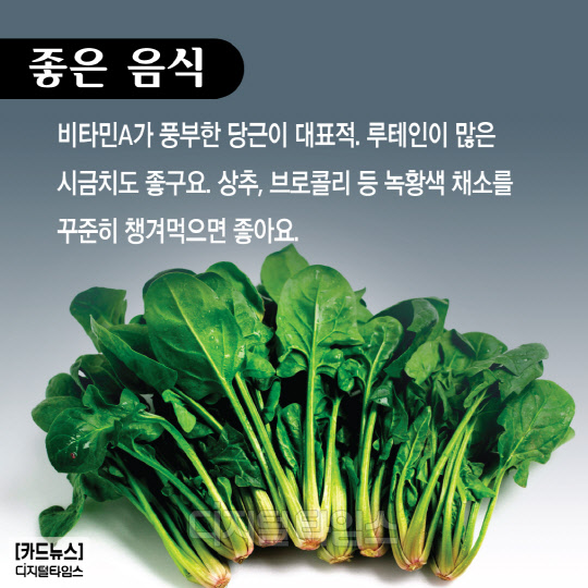 비타민A가 풍부한 당근이 대표적. 루테인이 많은 시금치도 좋구요.