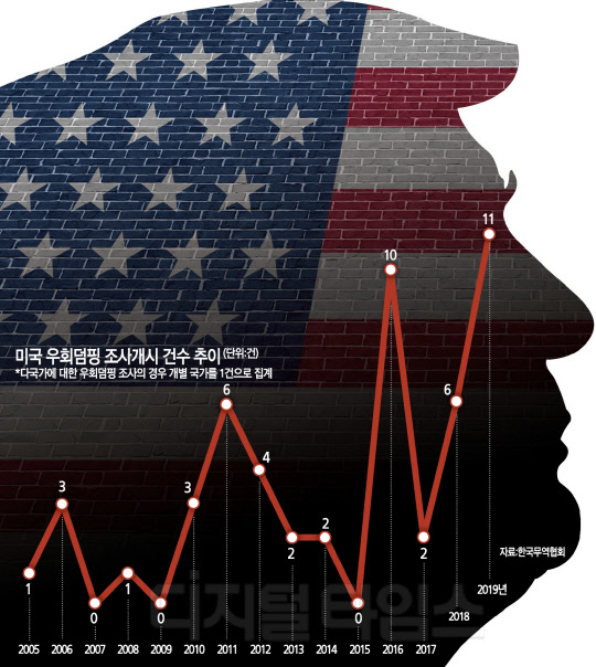 15일 한국무역협회의 '주요국의 우회덤핑 규제 현황과 실무적 쟁점' 보고서에 따르면 미국이 올들어 실시한 우회덤핑 조사는 모두 11건으로, 2016년(10건)에 세웠던 역대 최고치를 이미 갈아치웠다. 2005년부터 2015년까지 연평균 2건에 불과했고, 2017년과 지난해에도 각각 3건과 6건에 불과했던 것과 비교하면 이례적인 급증세다. 특히 지난 8월 중국·대만산 도금강판에 대해서는 직권으로 우회덤핑 조사를 실시하면서 업계를 긴장시켰다.