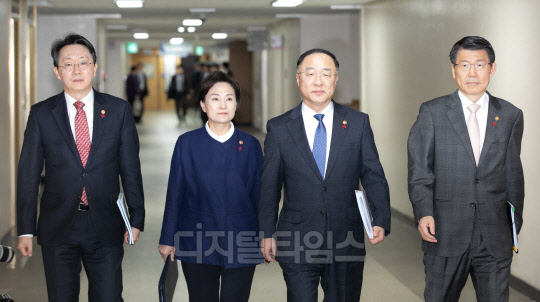 홍남기 경제부총리 겸 기획재정부 장관 등 국무위원들이 12일 종로구 정부서울청사에서 주택시장 안정화 방안 관련 관계부처 합동브리핑을 위해 입장하고 있다. 왼쪽부터 김현준 국세청장, 김현미 국토교통부 장관, 홍 부총리, 은성수 금융위원장.