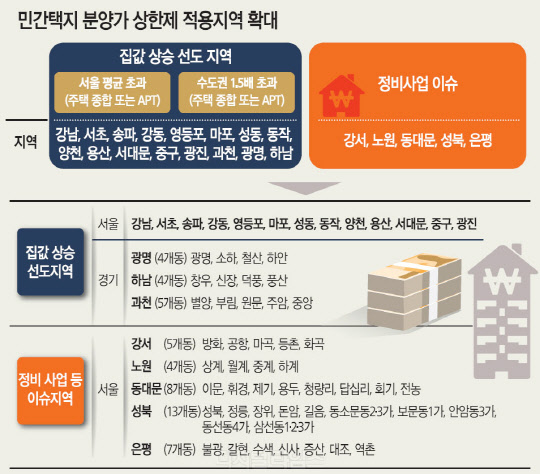 서울이 아닌 수도권에서 집값 상승을 주도한 과천·광명·하남시의 13개 동도 추가됐다. 정부는 지난달 초 서울 27개동에 상한제 대상지를 집중 지정한 뒤 한달여 만에 서울 주요 '구' 단위와 수도권으로 대상 범위를 넓혔다.