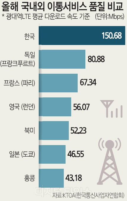 국내 LTE 평균 다운로드 속도는 150.68Mbps로 북미 평균 속도인 52.23Mbps보다 약 3배 빠른 것으로 나타났다. 아시아와 유럽 주요국과 비교해도 한국의 LTE 속도는 월등히 빨랐다. 일본 도쿄의 LTE 평균 다운로드 속도는 46.55Mbps, 홍콩은 43.18Mbps, 영국 56.07Mbps, 프랑스 파리 67.34Mbps로 나타났다. 조사국 중 가장 빠른 속도를 기록한 독일은 80.88Mbps지만 한국과 비교하면 절반 수준이다.