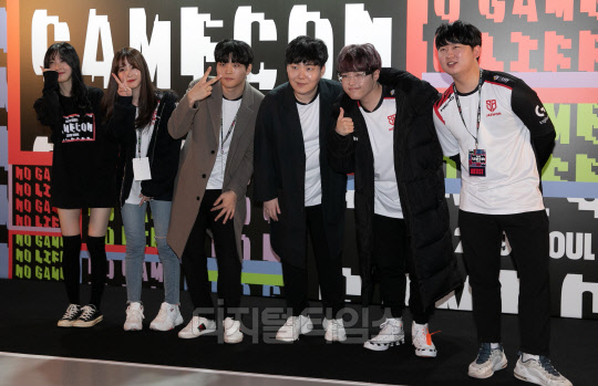 21일 서울 동대문디자인플라자(DDP)에서 열린 게임콘 2019 서울(GAMECON 2019 SEOUL)에서 샌드박스 네트워크(김제원, 루밍쨩, 원정상, 사모장, 빅헤드, 지라라) 크리에이터들이 오버워치 대회 '샌다전'을 마친 뒤 포즈를 취하고 있다.