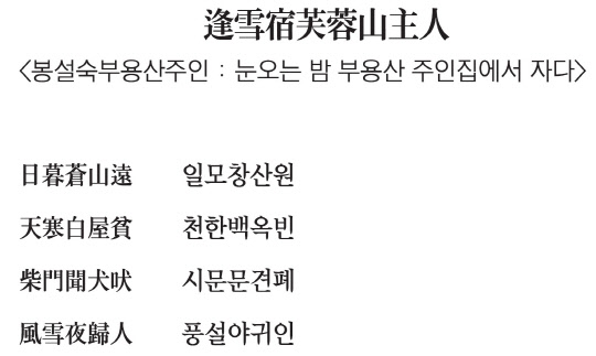중당(中唐)시대 시인 유장경(劉長卿)의 오언절구다. 눈보라 치는 저녁, 나그네는 먼 길 가야하는데 걱정이다. 부용산 근처에서 초라한 집을 발견하고 묵어가길 청한다. 개가 짖는 걸 보니 아마 집주인이 돌아오는 모양이다. 푸른산에서 초가집으로, 다시 사립문으로 이어지는 묘사가 일품이다. 개가 짖어대는 풍경이 선명하게 떠오른다. 짧은 시 안에 눈 오는 밤의 정경과 유배길 떠나는 시인의 감정이 진하게 녹아있다.