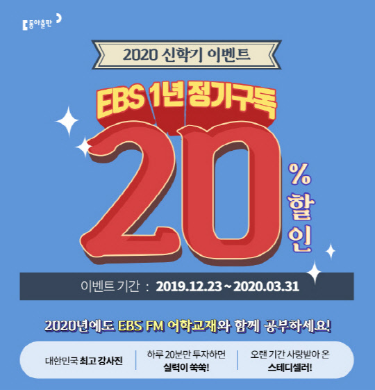 2019년 12월 23일부터 2020년 3월 31일까지 진행되는 이번 신학기 이벤트는 EBS FM 어학교재 10종을 대상으로 하는 기간 한정 이벤트로, 1년 정기구독 시 20% 할인 혜택을 제공하는 내용이다.