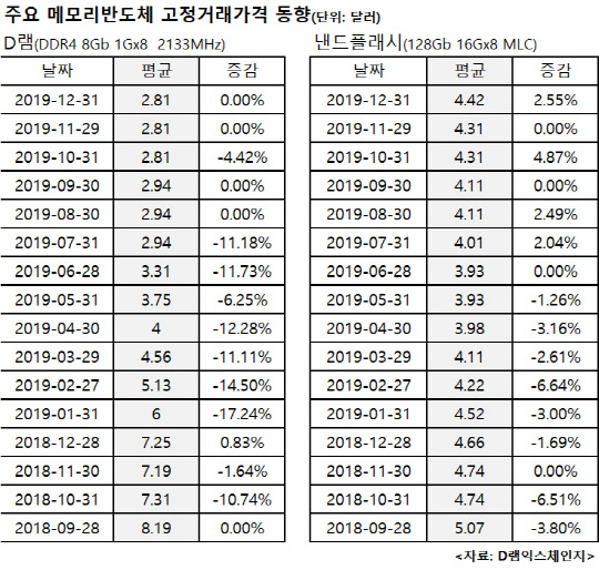 실제로 1일 시장조사업체 D램익스체인지에 따르면 D램(DDR4 8Gb) 가격은 작년 10월 말 2.81달러로 1년 전과 비교해 거의 4분의 1 수준까지 급락했지만, 최근 두 달 연속 보합세를 유지하며 반등을 위한 바닥 다지기에 들어갔다. 이들은 "D램 현물 시장에서는 11월 18일 이후 이미 9.5% 반등했다"며, 안정적인 재고 확보를 위한 구매 수요가 늘면서 PC용에 이어 서버와 그래픽용 D램 가격도 빠르게 반등할 것으로 분석했다.