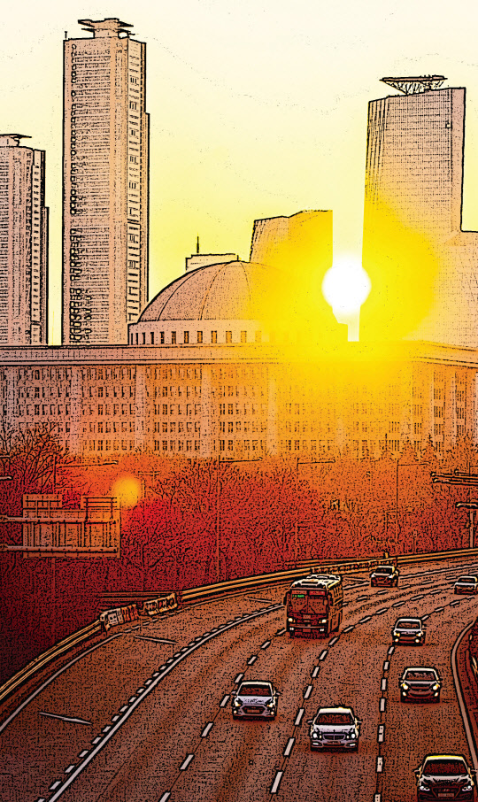 21대 총선이 실시되는 2020년 경자년(庚子年), 새해에는 서울 여의도 증권가와 국회를 배경으로 떠오르는 태양처럼 정치와 경제 모두 밝게 빛나는 한 해가 되길 기원해본다.(포토샵 필터링 작업)