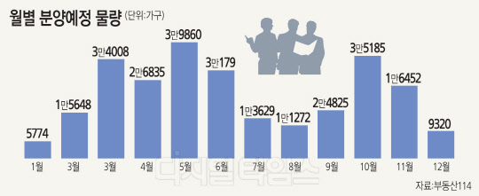 월별 분양물량을 살펴보면 5월이 3만9860가구로 가장 많고 10월(3만5185가구), 3월(3만4008가구) 순으로 집계됐다.