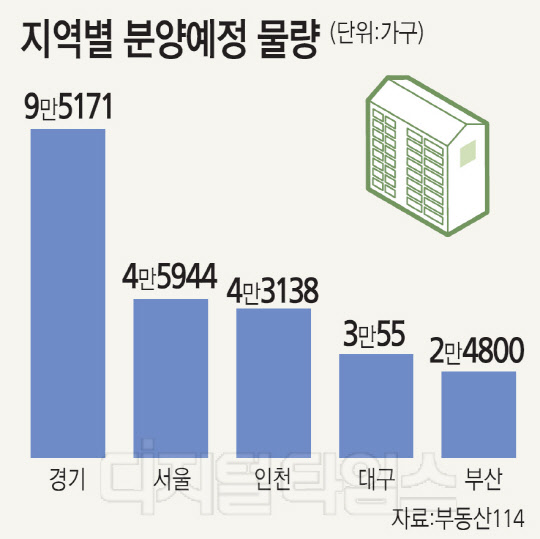 지역별로 살펴보면 전체 분양물량의 절반 가량인 14만여 가구가 서울과 경기에 집중됐다. 올해 서울은 4만5944가구, 경기는 9만5171가구가 분양된다. 이 밖에 인천에서도 4만3138가구가 공급될 예정이다.