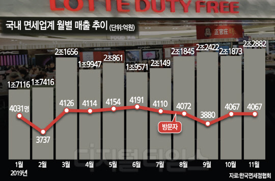 한국면세점협회에 따르면 지난해 11월 국내 면세점 매출은 2조2882억원으로 사상 최대 매출 기록을 또 한 번 경신했다. 지난해 3월 사상 처음으로 월 매출 2조원을 경신한 면세업계는 11월까지 월 매출 2조원대를 7회 기록했다. 연말 특수가 있는 12월에도 2조원 매출이 유력하다. 11월까지의 누적 매출만 22조5738억원으로 2018년 18조9502억원을 훌쩍 뛰어넘었다. 역시 최대 실적을 경신 중인 롯데와 신라, 신세계 등 '빅 3'의 선전에 따른 것이란 분석이다. 업계에서는 국내 면세점 매출의 80% 이상이 '빅 3'에서 나오는 것으로 본다.