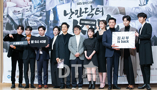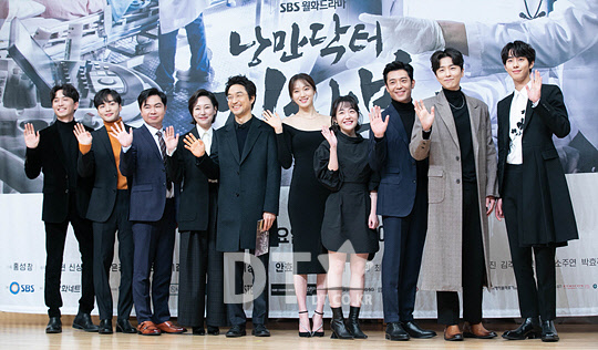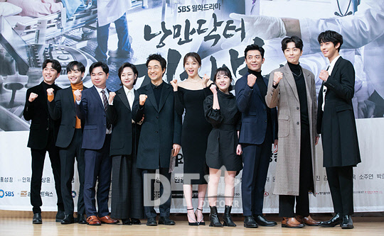 배우 윤나무(왼쪽부터), 김민재, 임원희, 진경, 한석규, 이성경, 소주연, 김주헌, 신동욱, 안효섭 등이 6일 서울 양천구 SBS에서 열린 드라마 '낭만닥터 김사부2' 제작발표회에서 포즈를 취하고 있다.