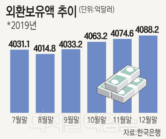 6일 한국은행이 발표한 '2019년 12월 말 외환보유액'에 따르면 우리나라의 지난해 12월 말 기준 외환보유액은 4088억2000만달러로 전월 말(4074억6000만달러) 대비 13억6000만달러 늘어난 것으로 집계됐다. 외환보유액은 지난해 10월부터 석 달 연속 사상 최대 기록을 세웠다.