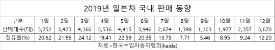 [디지털타임스 김양혁 기자] 일본차 업계가 작년 불매운동 파고를 넘고 두 자릿수 점유율을 지키는 데 성공했다. 작년 9월 월 1000대 판매도 위태롭다는 우려가 제기됐지만, 연말까지 이어진 대규모 판촉에 힘입은 결과다. 작년 마지막 달 판매량은 불매운동 이후 최다 수준으로, 불매운동 이전까지 더 해도 다섯 번째로 많다. 일본차 업체로선 당분간 판촉이라는 돌파구 외에 딱히 뾰족한 수가 보이지 않는다.