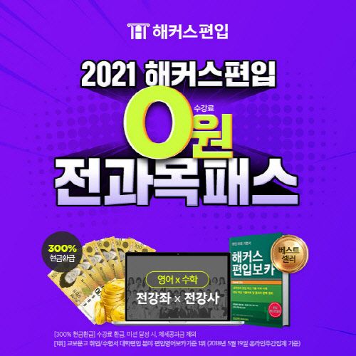 해커스편입의 '2021 전 과목 0원 패스'는 한 번의 결제로 2021년까지 조건 없이 수강 기간을 보장해 주기 때문에 편입준비생은 넉넉한 수강 기간으로 대학편입을 준비할 수 있다. 해당 패스는 편입영어, 편입수학뿐만 아니라 토익(TOEIC), 텝스(TEPS) 등 공인영어편입을 준비하는 학생들을 위해 공인영어 인강까지 제공한다. 추가로, 인강임에도 카카오톡 메시지와 게시판을 통해 교수와 직접 질의응답이 가능하다.