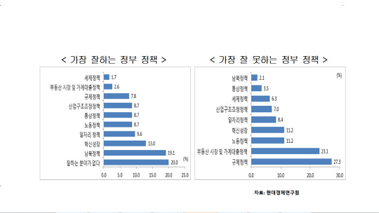 정부 정책 중 가장 못하고 있는 분야는 규제정책(27.3%), 부동산 및 가계대출 정책(23.1%), 노동정책(11.2%), 혁신성장정책(11.2%), 일자리 정책(8.4%), 산업구조조정(7.0%), 세제(6.3%) 통상(3.5%) 남북(2.1%) 등의 순이었다.