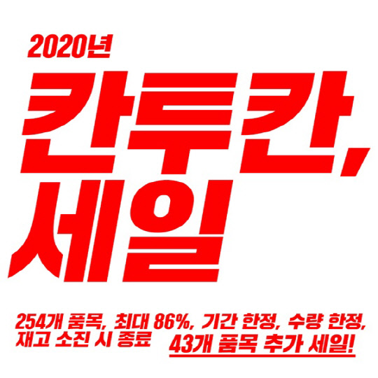 앞서 칸투칸은 2020년 새해 시작과 함께 구스바지, 방한화, 니트 등 칸투칸의 주요 제품 211개를 최대 80% 할인가에 제공하는 정기세일을 진행했다.