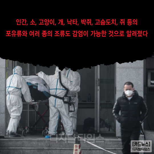 2. 인간, 소, 고양이, 개, 낙타, 박쥐, 고슴도치, 쥐 등의 포유류와 여러 종의 조류도 감염이 가능한 것으로 알려졌다